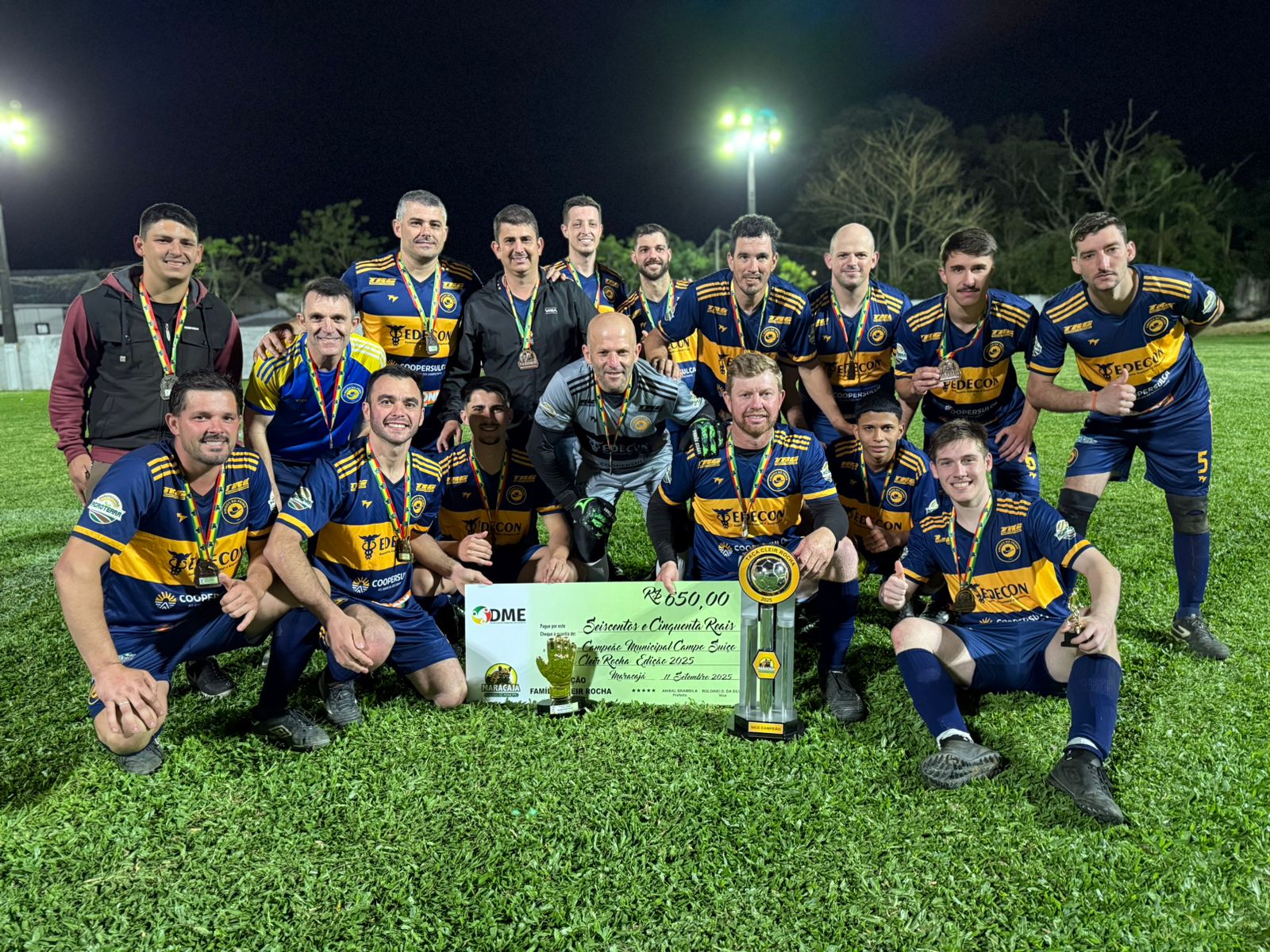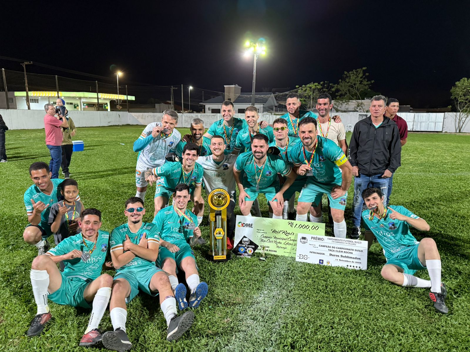 “O Departamento de Esporte de Maracajá agradece a todos que fizeram parte do Campeonato de Futebol Suíço – Taça Cleir Rocha 2025. Nossa gratidão à família de Cleir Rocha, que deu nome a esta edição do campeonato. Parabéns ao Atlético Maracajá – Campeão. Parabéns ao Amigos do Primo – Vice-campeão. Agradecemos também às equipes Espigão Grande, Criazinhas, Vila Beatriz e São Cristóvão pela participação e dedicação. Nosso reconhecimento às autoridades presentes, a toda equipe da Prefeitura, ao setor de Saúde, à imprensa, ao jurídico, à arbitragem do Centro Esportivo e ao patrocinador Evandro Carradore. Um agradecimento especial ao público, que prestigiou não apenas a grande final, mas também todas as partidas do campeonato.”