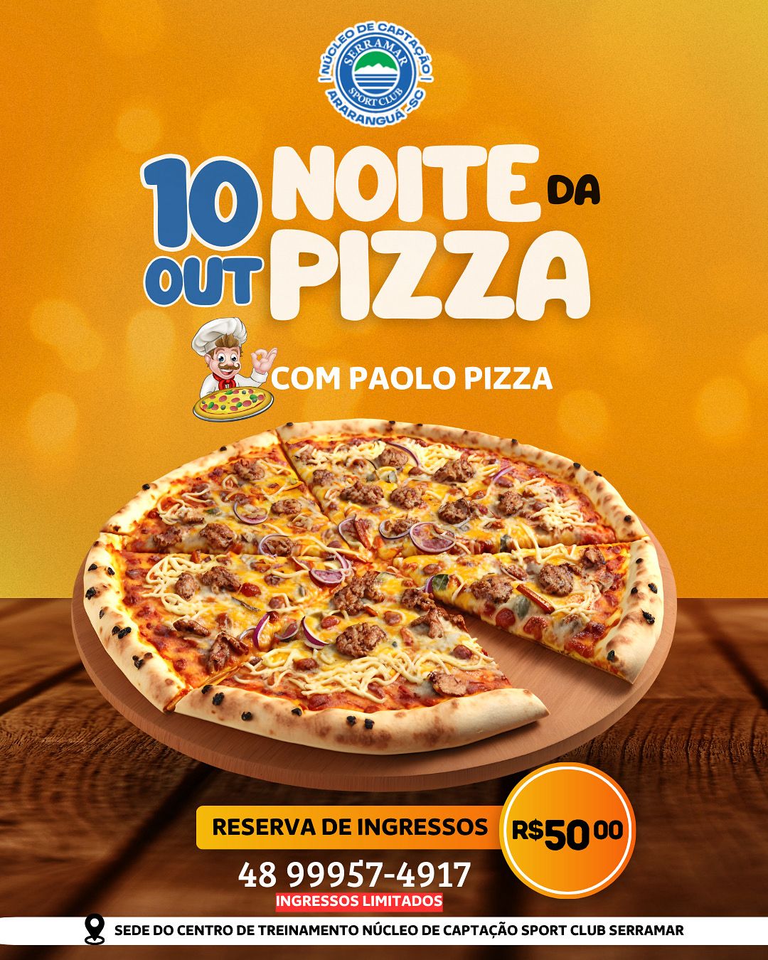 Depois do sucesso da Galinhada, o Núcleo de Captação Serramar, promove a Noite da Pizza, para que todos possam sentir o verdadeiro sabor de uma pizza servida por quem intende do assunto, e o mestre das pizzas Paolo Pizza, estará servindo as delicias na noite especial com música ao vivo na sede do Núcleo de Captação Sport Club Serramar.
