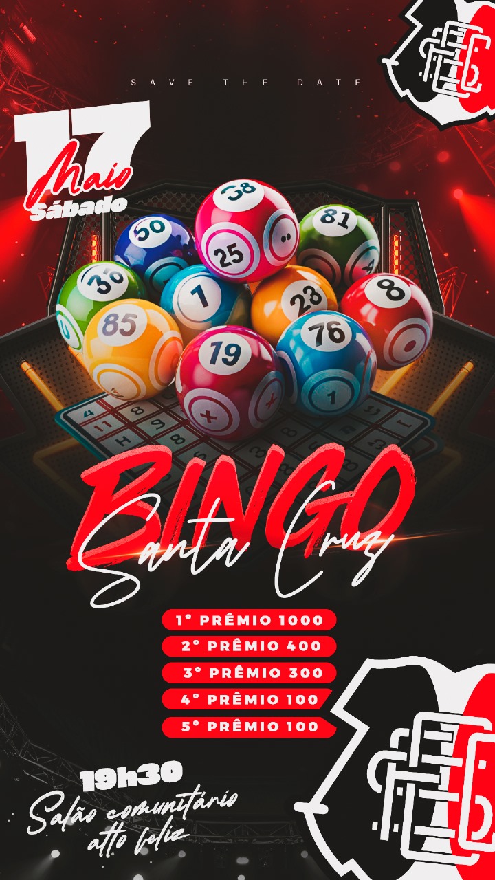 A equipe do Santa Cruz do bairro Mato Alto, organiza no próximo sábado (17) o seu Bingo para arrecadar fundos para ajudar a equipe no campeonato municipal de Araranguá. O bingo contara com prêmios em dinheiro e ainda prêmios extas e rodadas extras. O bingo terá inicio as 19:30h, as cartelas estão sendo vendidas a R$10,00 dez reais cada, e ainda haverá salgados, doces e bebidas a venda. Então quem ainda não adquiriu sua cartela, chama que ainda tem, e boa sorte a todos