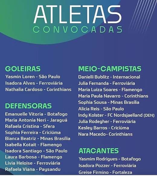 O Criciúma Esporte Clube celebra a convocação das atletas Sophia Ferreira, defensora, e Kesley Barros, meio-campista, para a Seleção Brasileira Feminina Sub-17. As duas seguem em destaque nas categorias de base do Tigre e conquistaram espaço na lista nacional após boas atuações ao longo da temporada.